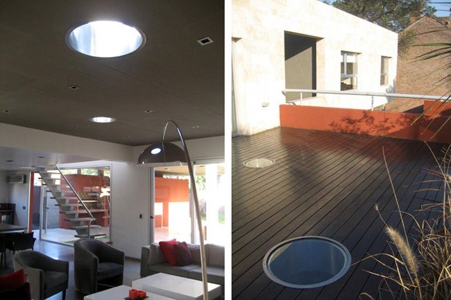 La planta baja es un único gran ambiente que unifica estar, comedor y cocina; el lugar social.Por un lado, hacia el fondo del terreno es totalmente transparente, aprovechando la mejor orientación y provocando un contacto directo con el césped y el agua de la piscina que prácticamente penetra el espacio del estar.Por el otro, hacia el frente de la casa y con la misma lógica de integrar el exterior, se pensó la ventana baja que da a un estanque que hace de barrera entre el garage y la casa, y se ahuecó la losa del estar con tres lucarnas circulares que permiten ver el cielo.El único tabique que hay en la planta baja, oculta el ingreso al toilette y la zona de trabajo de la cocina.